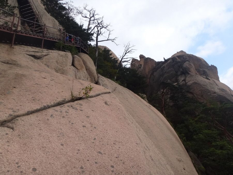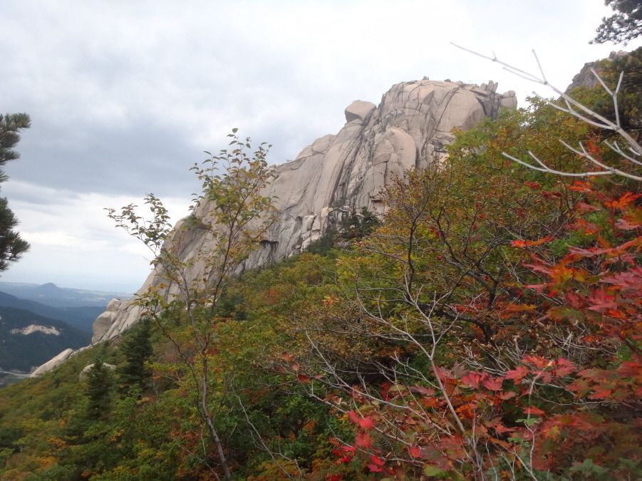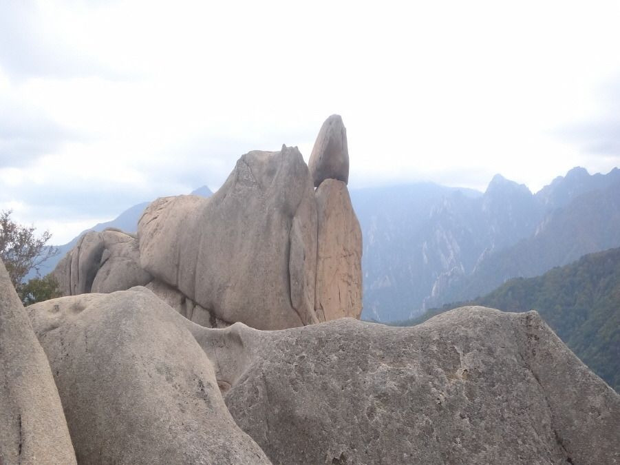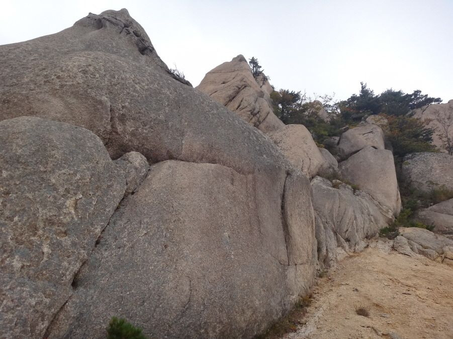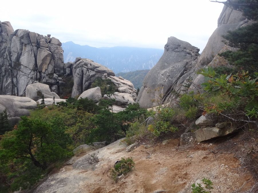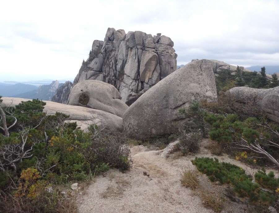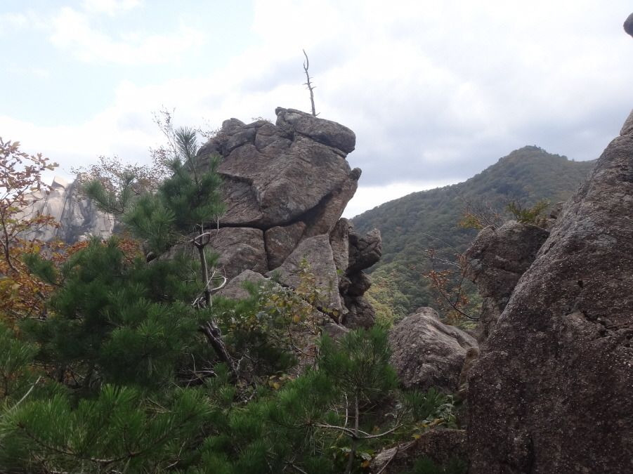 하산길에 든다. 달마봉은 시간상 물 건너 갔고 오래전 오른 울산바위 전망대를 오르기로 한다. 계조암까지 갔다가 울산바위를 다시 오른다는 것은 체력적으로나 시간상 낭비다. 약10분정도 내려오다가 울산바위를 좌측에 두고 크게 허리길(다람쥐길)로 진행하면 흔들바위와 정면의 계조암에서 올라오는 정규 등산로를 만난다. 중간에 잘못 오르면 릿지 등반길로 들수 있으니 무조건 허리길로 진행하면 정규등산로다. 바로 잘 정비된 목책계단길 오른다. 울산바위 전망대다.[2.0km][50분]