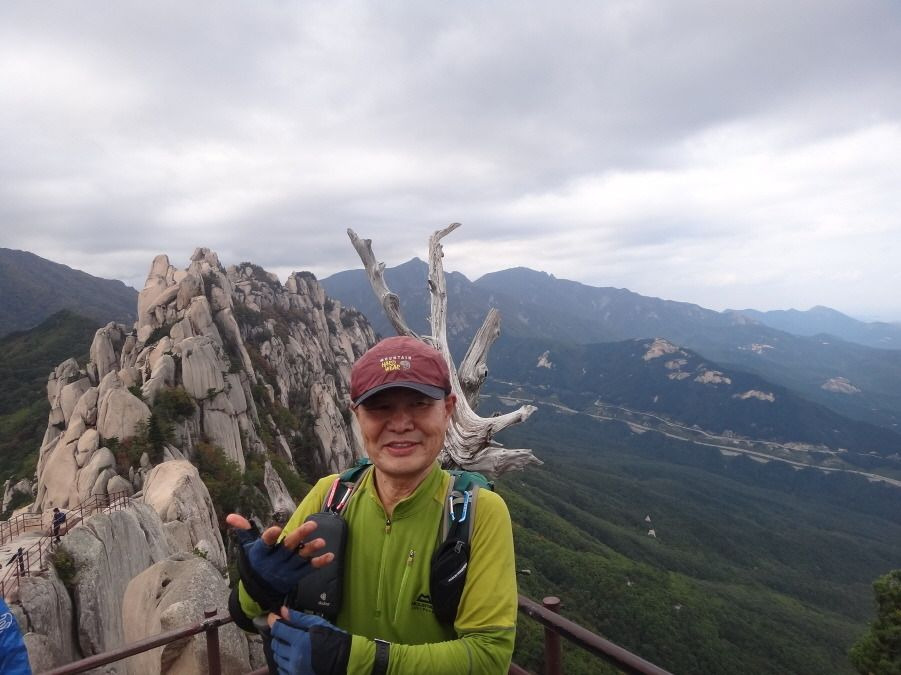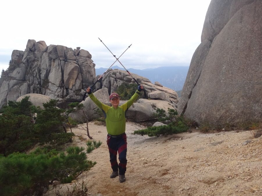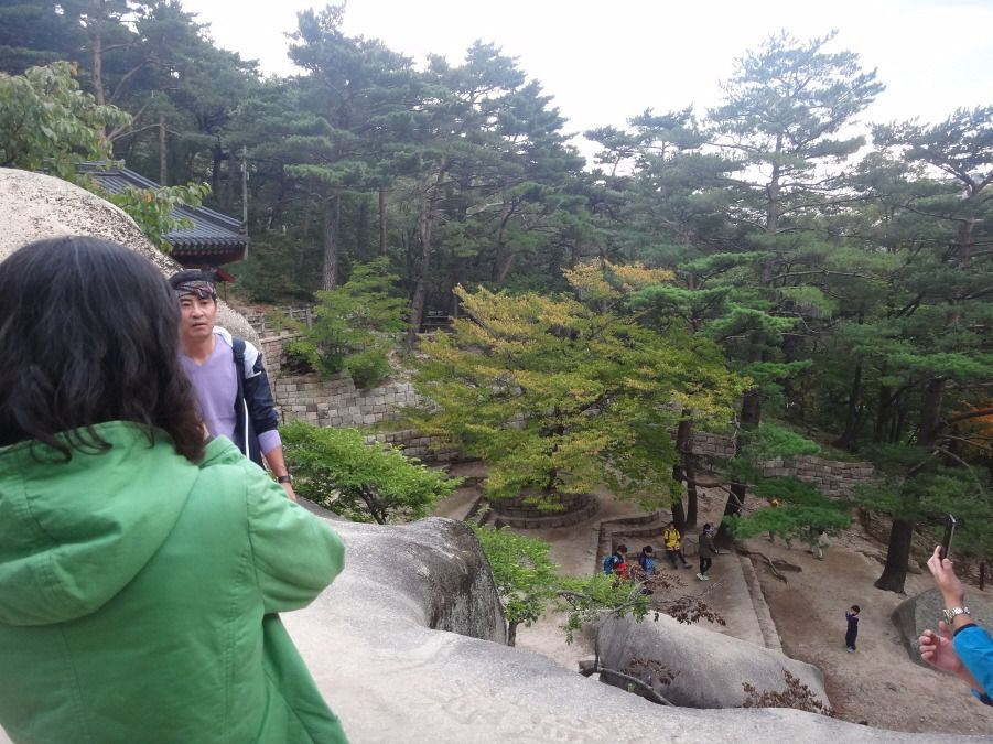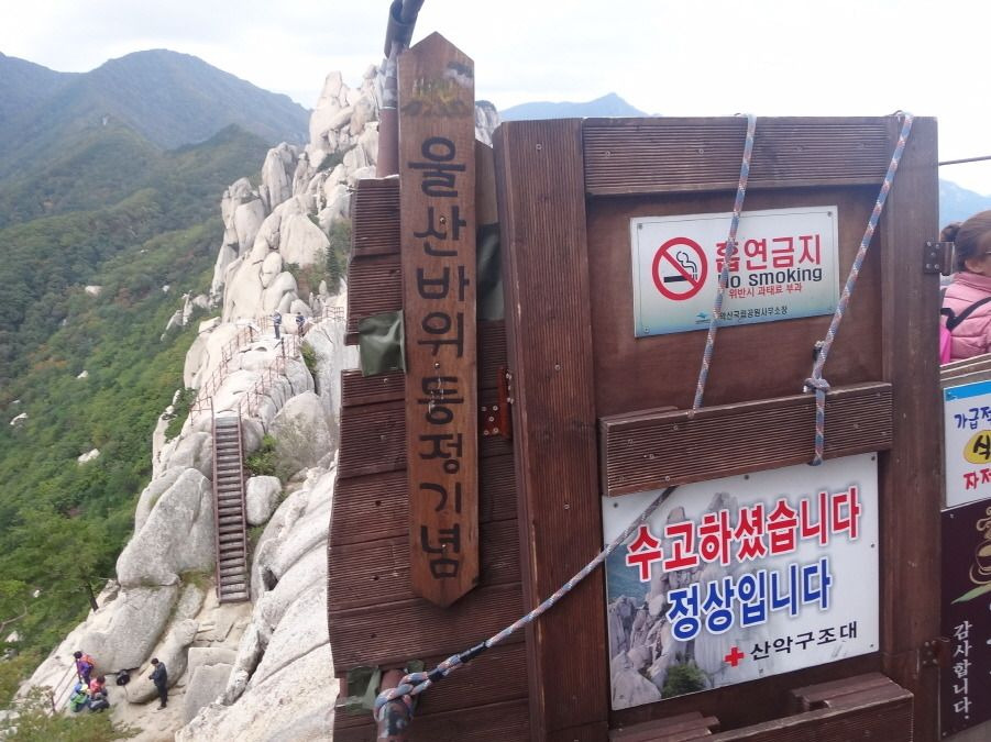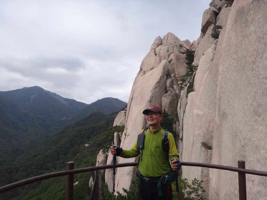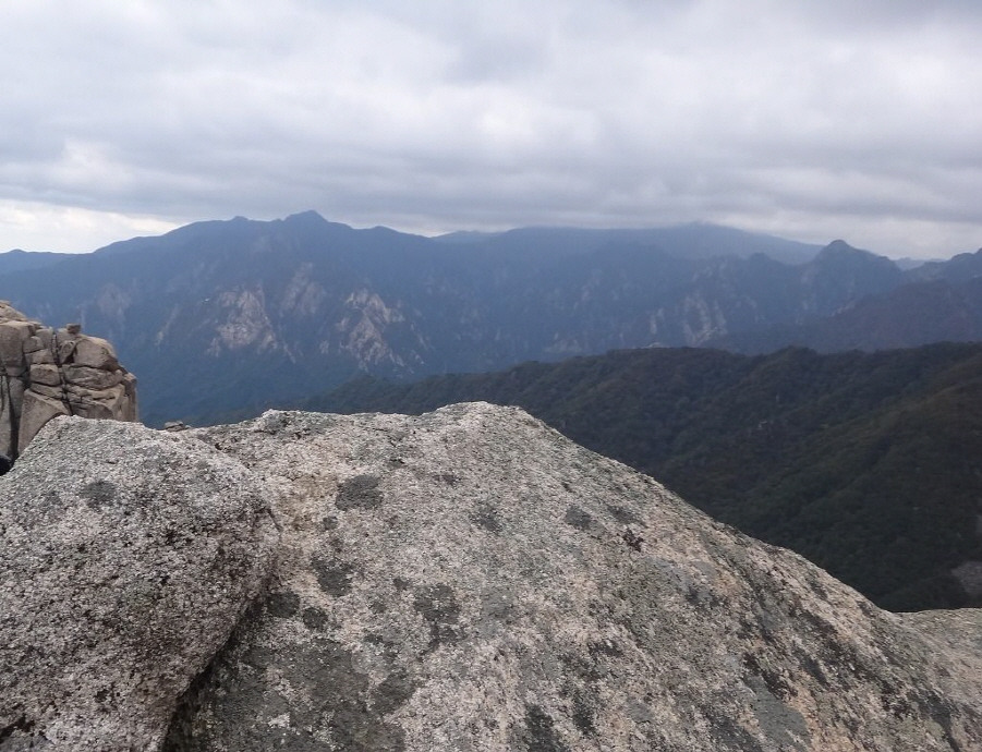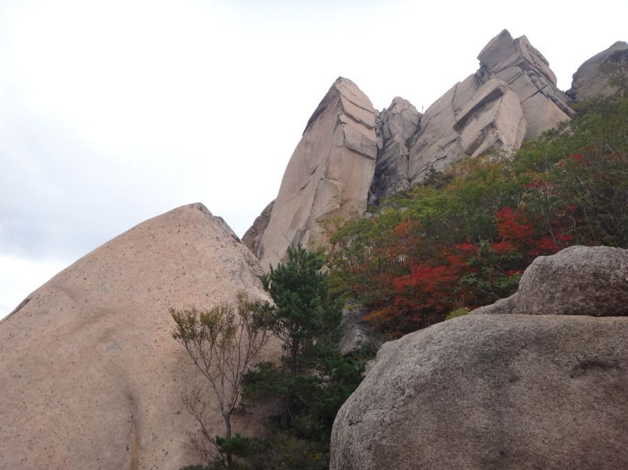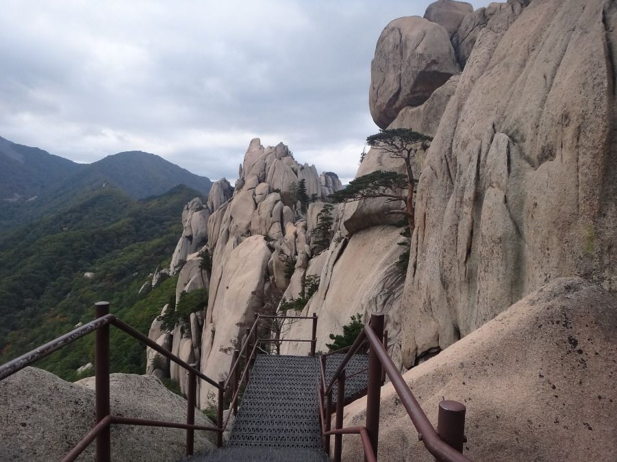 하산길에 든다. 달마봉은 시간상 물 건너 갔고 오래전 오른 울산바위 전망대를 오르기로 한다. 계조암까지 갔다가 울산바위를 다시 오른다는 것은 체력적으로나 시간상 낭비다. 약10분정도 내려오다가 울산바위를 좌측에 두고 크게 허리길(다람쥐길)로 진행하면 흔들바위와 정면의 계조암에서 올라오는 정규 등산로를 만난다. 중간에 잘못 오르면 릿지 등반길로 들수 있으니 무조건 허리길로 진행하면 정규등산로다. 바로 잘 정비된 목책계단길 오른다. 울산바위 전망대다.[2.0km][50분]