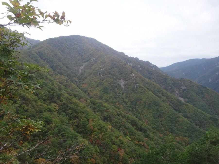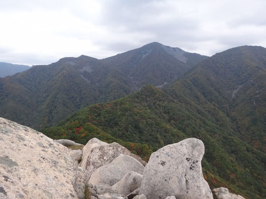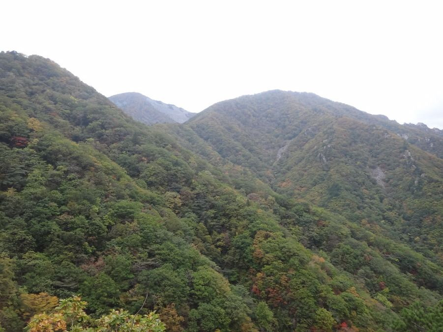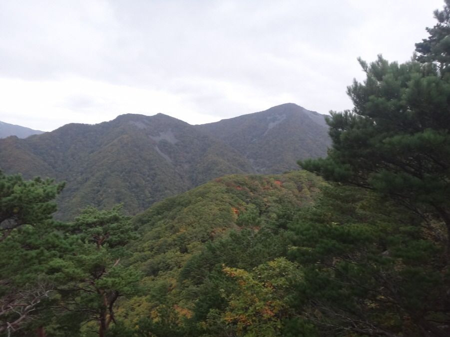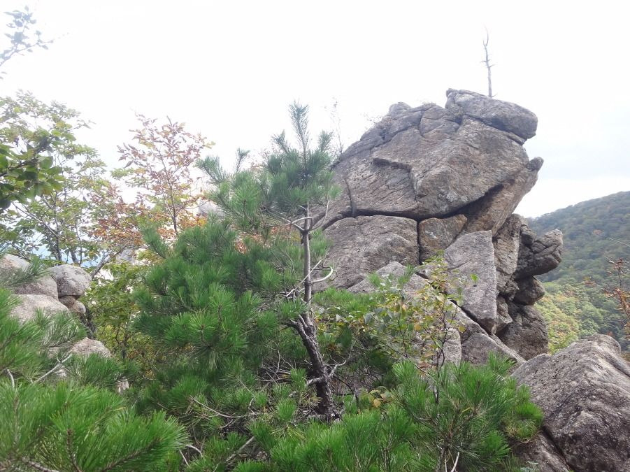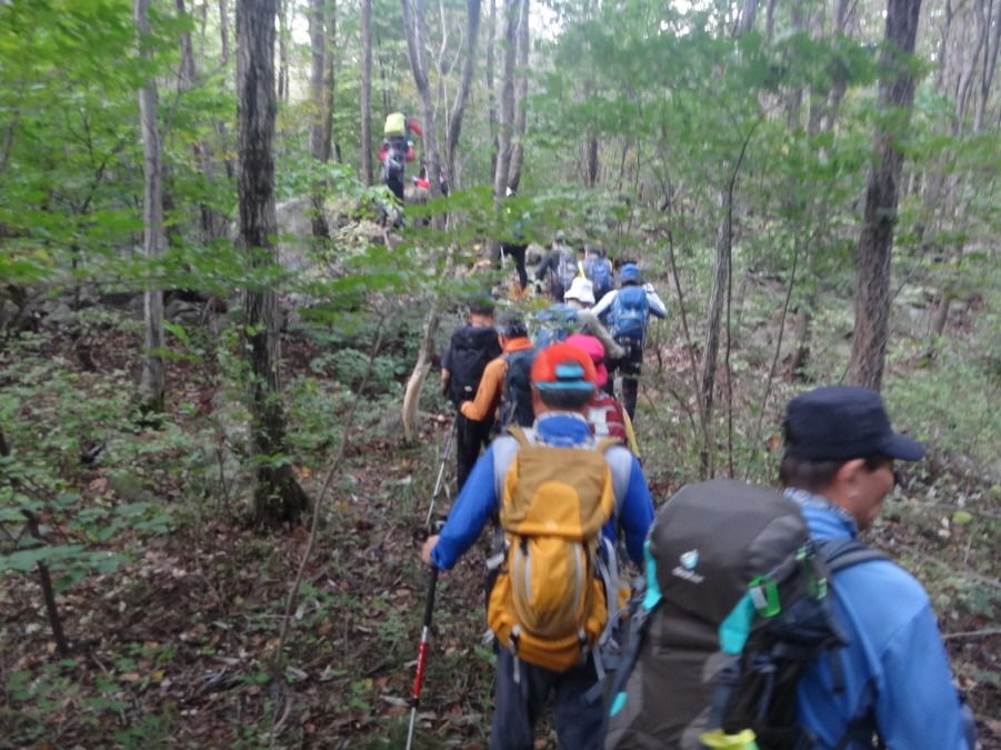 약40분 급경사 알바길 능선길을 오르면 만나는 능선상의 암릉에서 급경사 내림길 내려 펑퍼짐한 곳에서 개척 허리길로 우향 계곡을 건너 다시 능선에 붙습니다. 이곳에서 대원들은 다시 우측 허리 개척길 진행하여 처음 놓친 등산로를 만나 호랑굴 안부로 진행하엿고 나를 믿은 10여명은 네비 컴토하여 진행할만한 능선길을 오릅니다. 13;30 멋진 암릉에서 주능선이 올려다 보입니다.