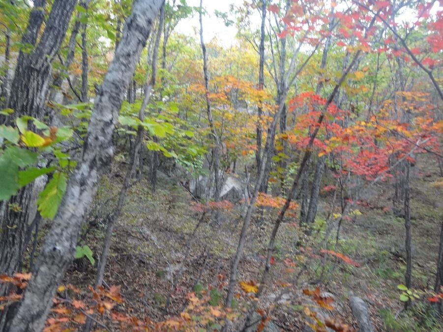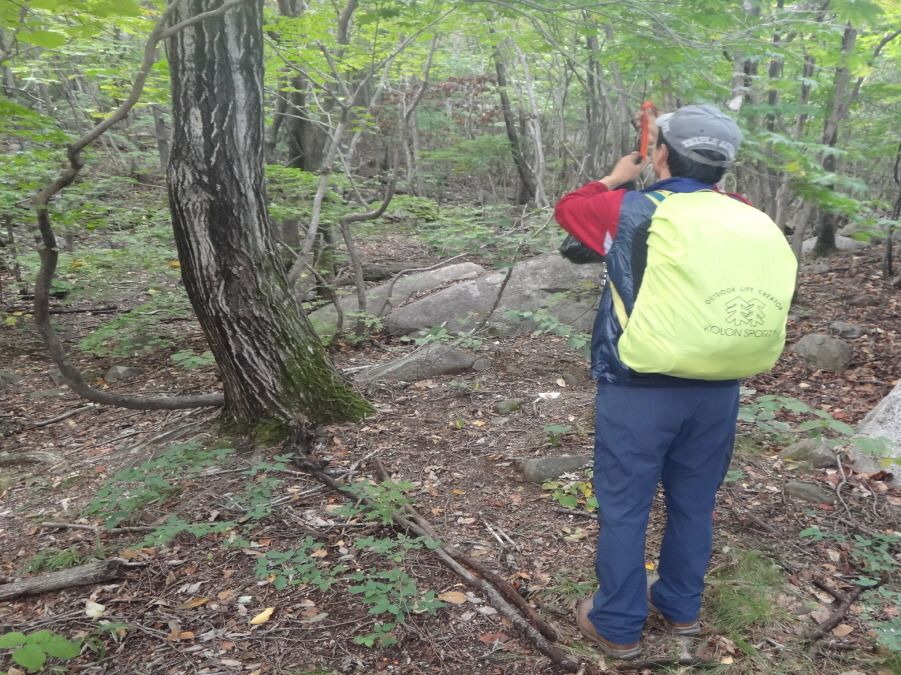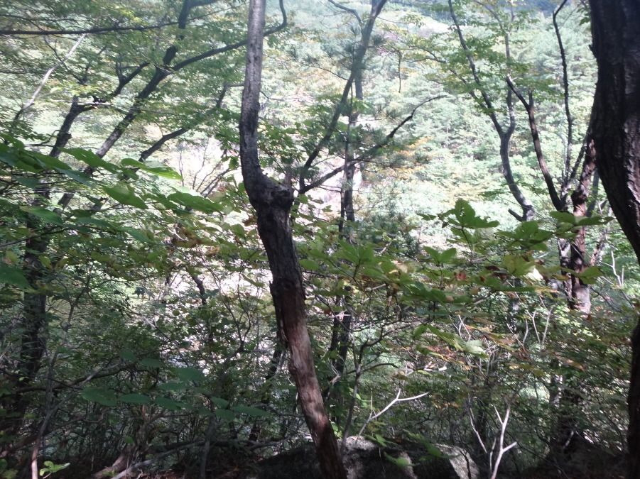 (cf그런데 아무 생각없이 선두그룹과 L대장이 앞서는 급경사 오름길을 오른다. GPS 궤적을 보니 말굽폭포에서 되돌아 올때 건넌 2계곡 사이의 능선을 오른 것이다. 암릉을 만난다. 일단 오른다. 선두 3분은 릿지길을 진행해 올랐다. 불러도 대답이 없고 너무 황철봉 방향이고 서봉과 멀어진다. Back을 결정하여 급경사 내림길 내려 경사가 완만해 지는 곳에서 허리길로 길없는 우측 계곡을 내려서 조금 부드러운 능선에 선다. 이곳에서도 다시 아래 건계곡으로 내려서면 처음 놓친길을 만날 수 있다.대부분의 대원들은 내려 갔다.)
