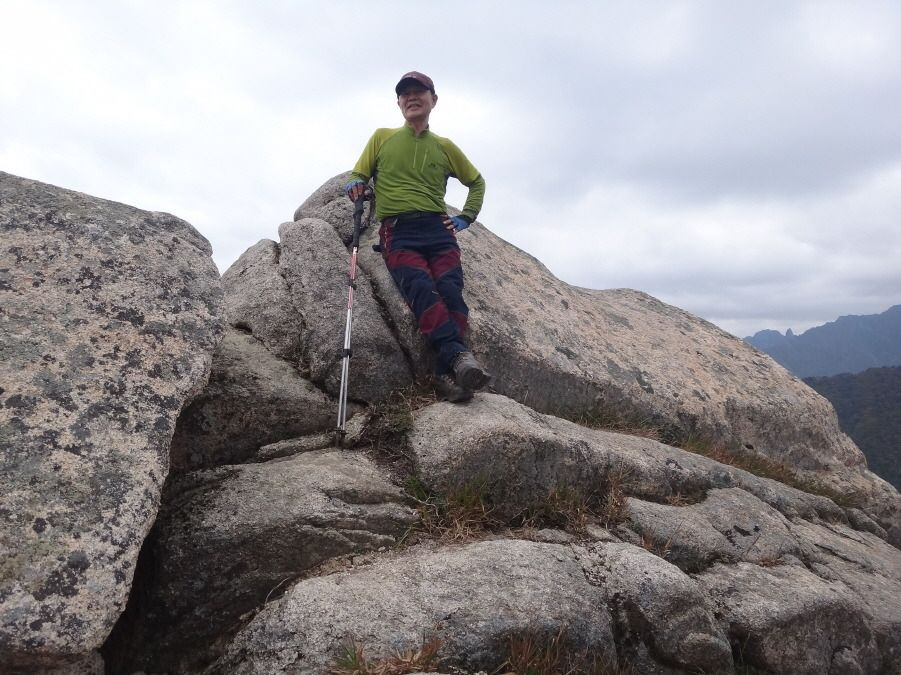 좌향 능선길 약 5분 정도 진행하니 석문(호랑이굴) 안부다. 후미대장님 포함 정상 등로로 편하게 올라와 서봉을 답사하고 내려온 대원들이 담소하고 있다. 베낭 두고 카메라만 들고 서봉에 오른다. 암릉길은 인공보조 시설이 되어 있지 않아도 지형지물이 잘되어 있어 오르는데 어려움이 없다. 드디어 서봉 정상이다.[0.5km][25분]