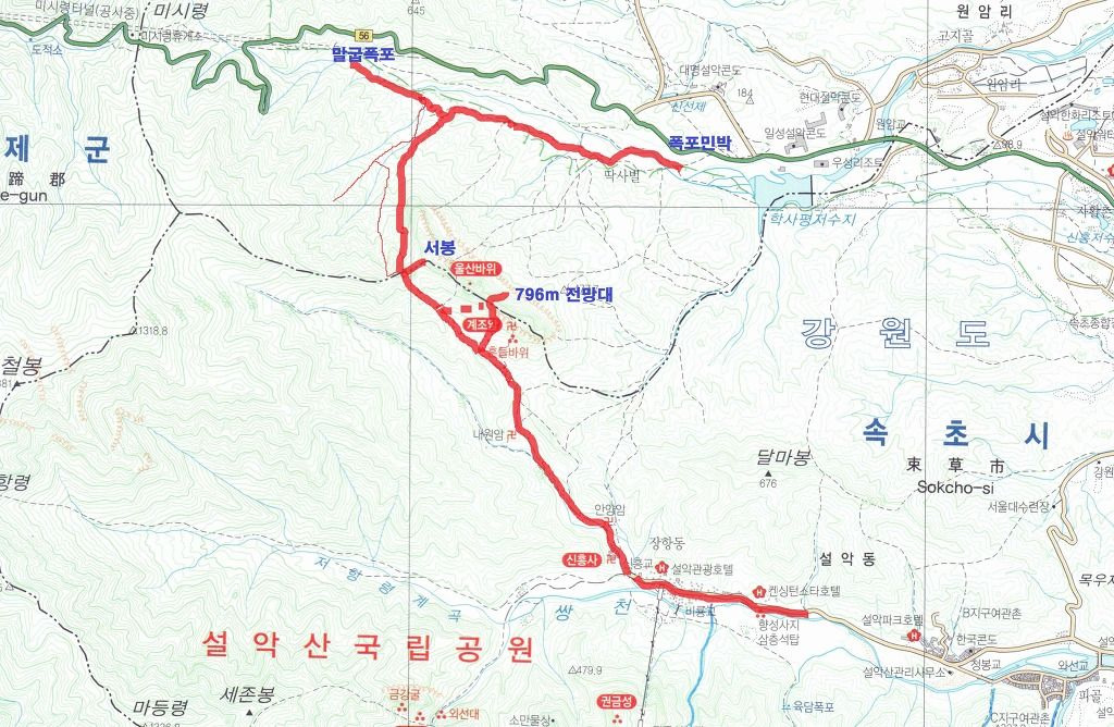 들머리를 ‘폭포민박집’으로 하면 길도 좋고 편하게 진행 할수있는데 이집 주인양반 자기집 손님은 길까지 안내해 주면서도 다른 등산객이 나타나면 미시령 탐방소 지킴터에 바로 신고 미시령 탐방소 직원들이 출동하여 통제를 함으로 산행을 못하게 하고 있다는 정보입니다. 10;40 ‘폭포민박집’ 근처 구길에 내려 신도로 지하터널을 빠져 나와 목소리 낮추고 발자욱 소리 죽여 가면서 미시령 쪽 구도로를 조금 걸어 오릅니다.