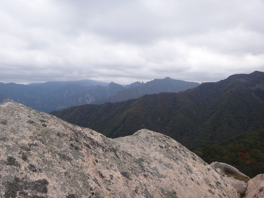 서봉 정상에 서니 앞뒤 양쪽의 거대한 암봉이 마치 항공모함처럼 눈앞에 서있다. 켜켜히 쌓인 바위들틈엔 기묘한 바위도 보인다. 벅찬 감동의 시간 약5분정도 조망을 즐긴다. 사방팔방으로 내려다보이는 조망은 우리나라에서 최고의 압권으로 속초시내를 한눈에 넣을수 있고 아름다운 설악 화채능선.천불동계곡. 권금성과 울산바위. 구름속의 대청. 공룡능선이 조망된다. 동봉은 손에 잡힐듯 가까이 있다. 둘레가 약4km인 장대한 울산바위등 비경에 취한다. 석문(호랑이굴)로 되돌아 온다.[0.5km][20분]