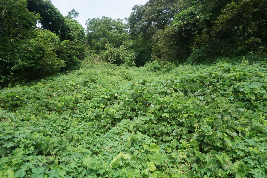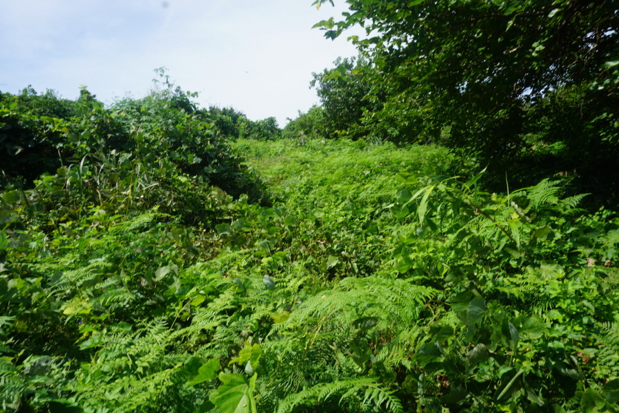 (11;15) 마지막 민가 옆 산길 진입 후 고사리밭 넝쿨지대를 뚫고 철조망울타리를 개구멍으로 통과 후 앞에 보이는 안벌 안(산)(40m) 정상에 섭니다.