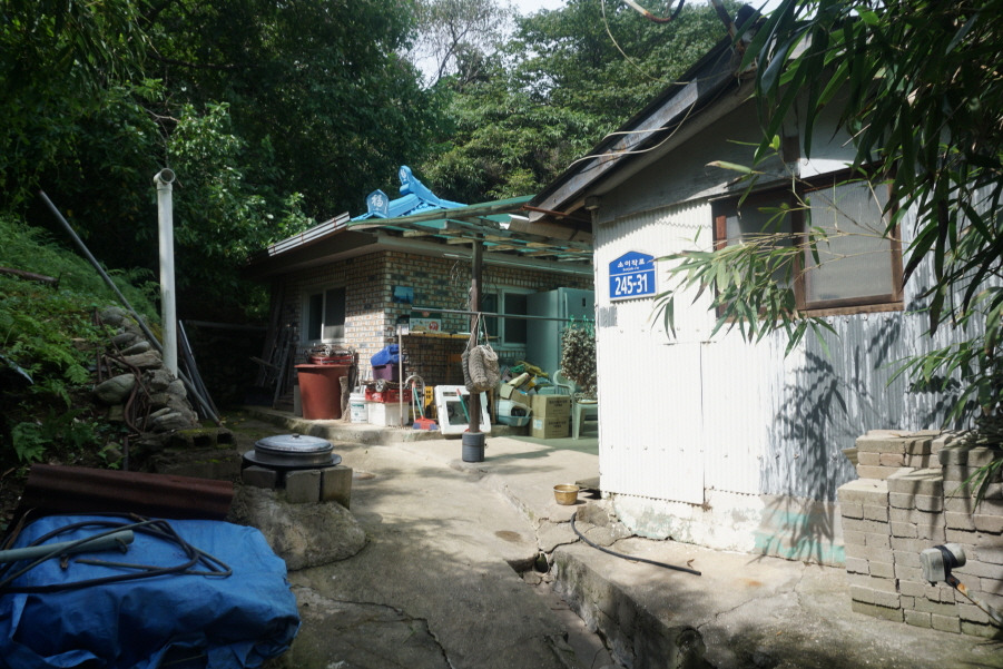 (11;29) 안벌 안(산)(40m) 정상에서 마지막민가(소이작로245-1)로 Back 합니다. 민가 뒤편이 안벌 안(산)(40m) 정상입니다