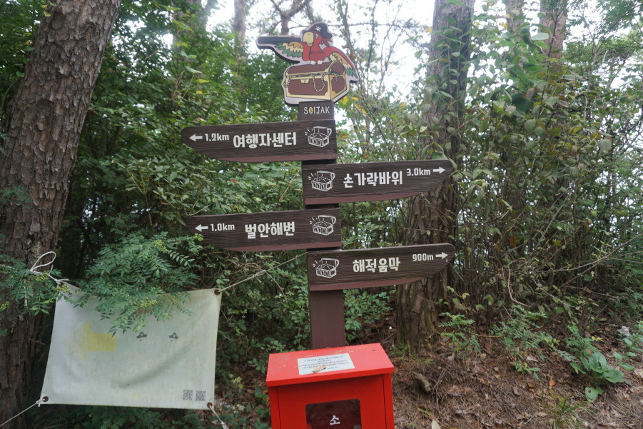 (12;00) 이정표(손가락바위 3.0km/해적움막 900m// 벌안해변 1.0km/여행자센터 1.2km)입니다