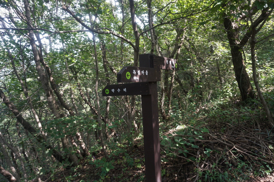 (10;57) 하산길 약수터 갈림 이정표(목섬마을 600m/약수터/전망대 300m)입니다