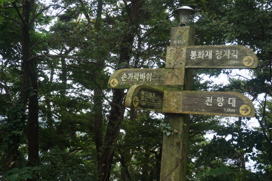 (12;39) 능선상 이정표(손가락바위 1.0km/봉화재 정자각 200m/전망대 1.0km/벌안마을 4.2km)입니다. 손가락바위에서 3거리까지 와서 선착장으로 Back 하지 않고 이정표(벌안마을 3.4km ) 따르다가 이곳 이정표(봉화재정자각 200m/전망대 1.0km) 방향 능선길을 가면 큰 산을 갈 수 있겠습니다.