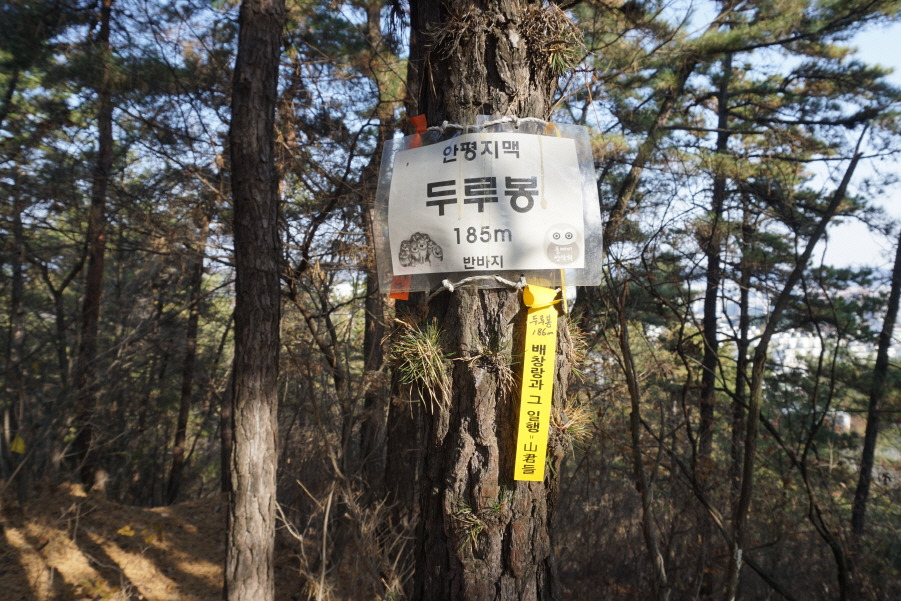 반바지님 비닐코팅 정상 표지판(안평지맥 /두루봉 185m) 매여있다.