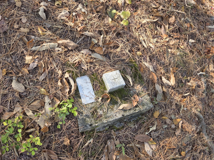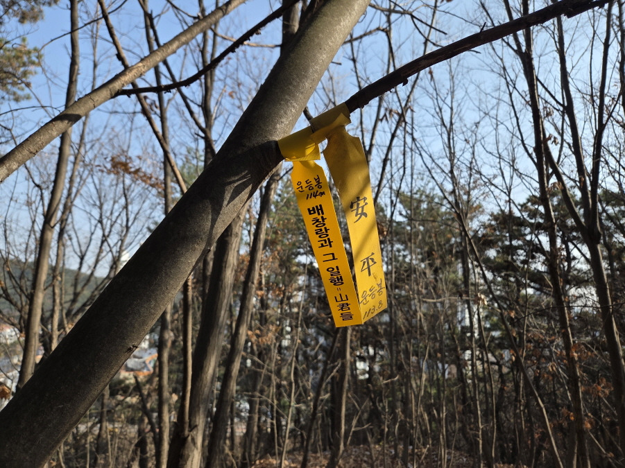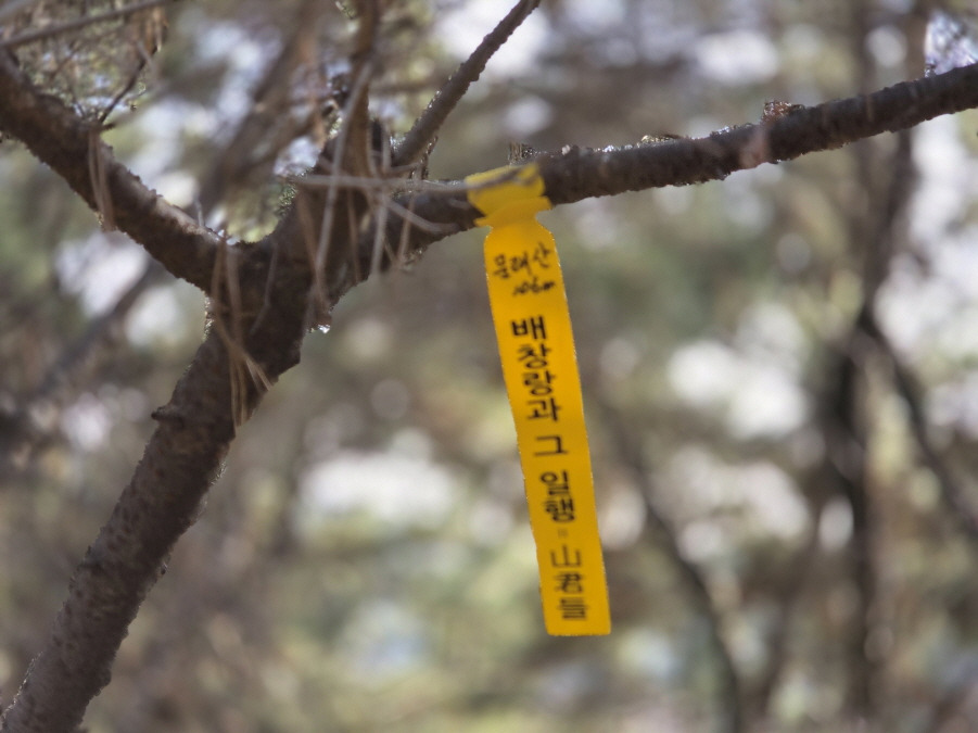 선답한 안평님 표지기 옆에 표지기"운등봉114m 배창랑과 그 일행=山君들"부착한다.