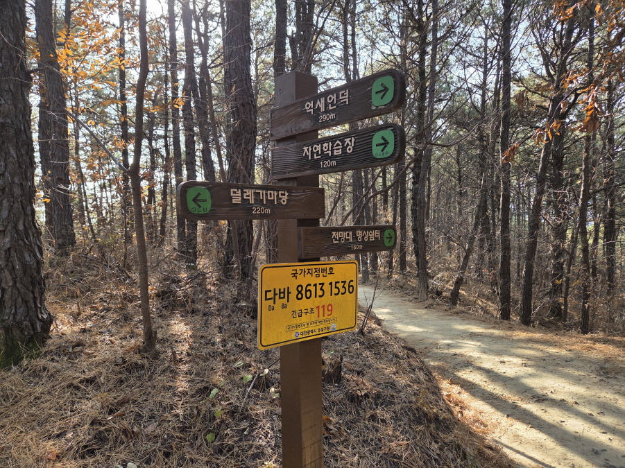 (13;21) 이정표(억새언덕 290m. 자연학습장 120m/덜레기마당 220m/전망대. 명상쉼터 160m)입니다