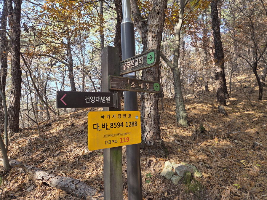 (12;18) 신설데크길 등로 따라 능선으로 오르다가 만난 이정표(소태봉/늘 푸른 교회/건양대병원)입니다.
