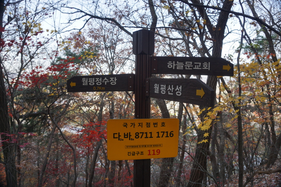 (09;14) 월평 정수장에서 올라오는 길과 합류하는 3거리 이정표(월평산성/월평정수장 0.7km/하늘문 교회)입니다