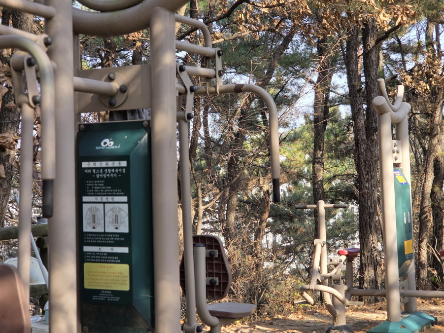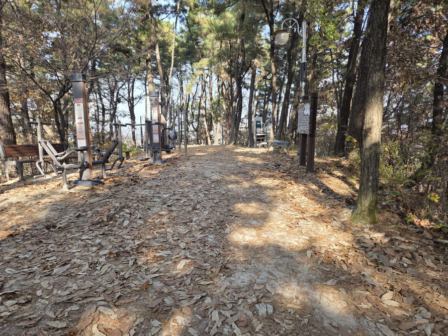 운동기구, 장의자, 옥녀봉 기우재 유래판. 옥녀봉숲길 안내판 서있다