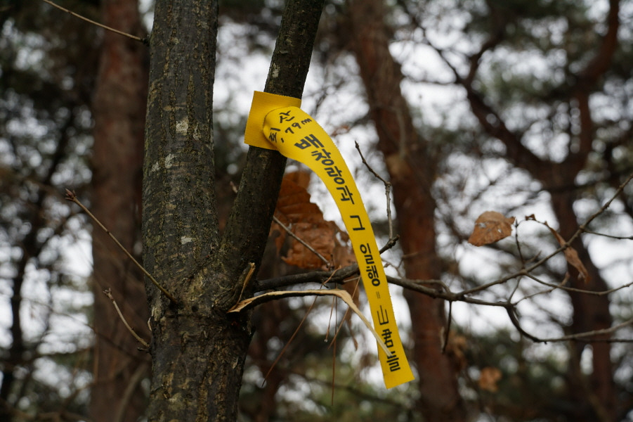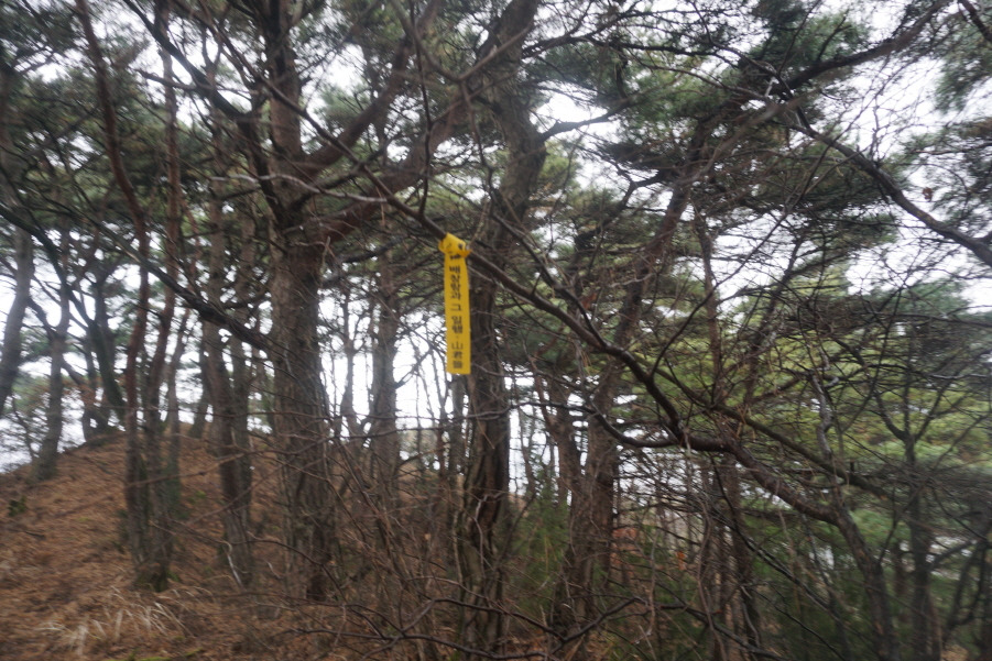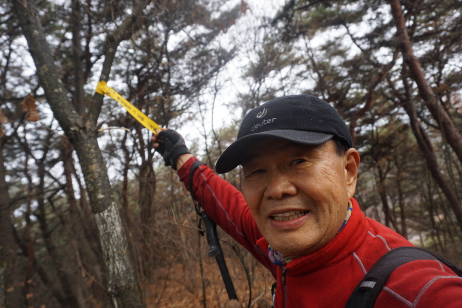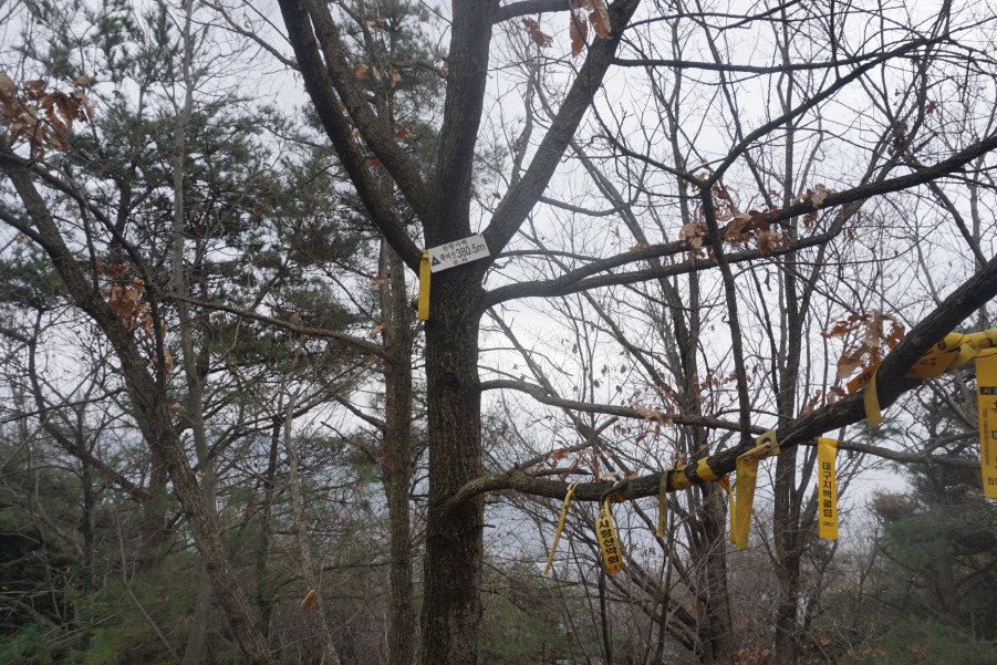 (12;29) 임도에서 잡목 급경사구간을 직진으로 올라야 호치 우측능선인데 호치를 깜박하고 편안하게 허리길로 능선에 붙어 호치를 왕복(왕복 약 1km/20분)한 지점(cf. 맥길로 어렵게 진행해 온 조종창 님의 "호치" 안 가느냐는 원인 (warning)을 듣고 아뿔싸 호치?~~ㅠ.ㅠ) 이후 약 500m 진행 호치(책여산 385m) 왕복하고 되돌아오는 길에 담은 표지기입니다. 조종창대장님 고맙습니다. 님의 원잉(warning) 덕분에 호치(책여산 385m)를 답사했습니다.