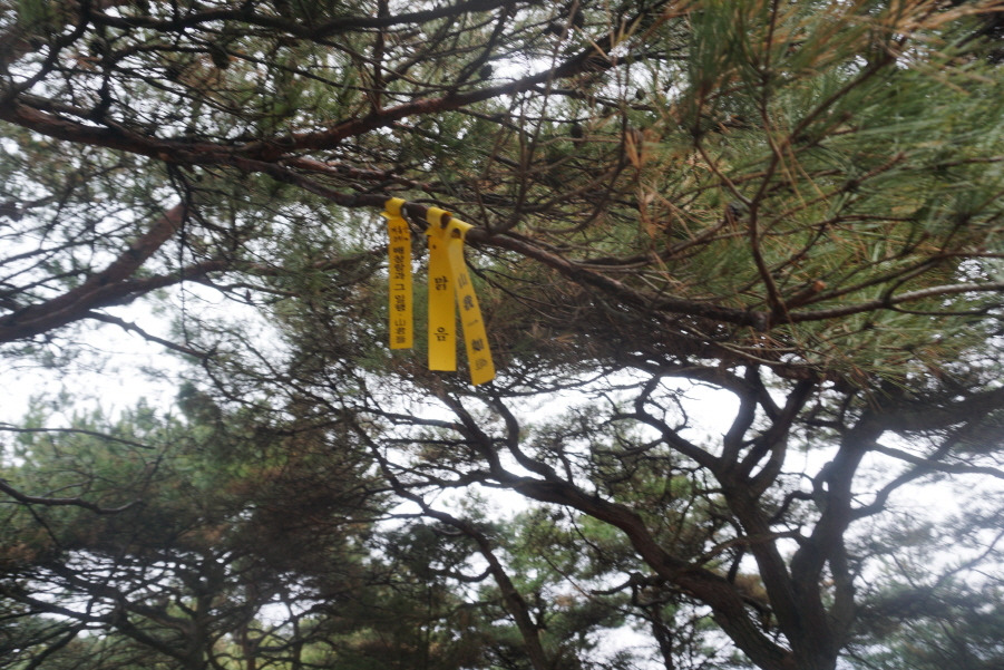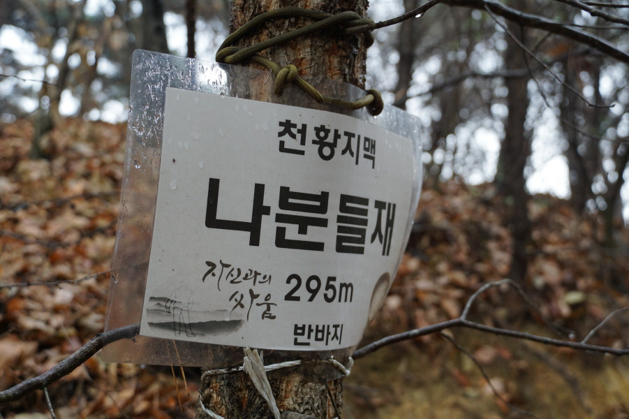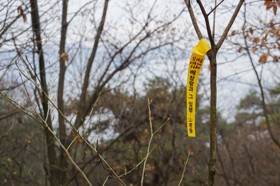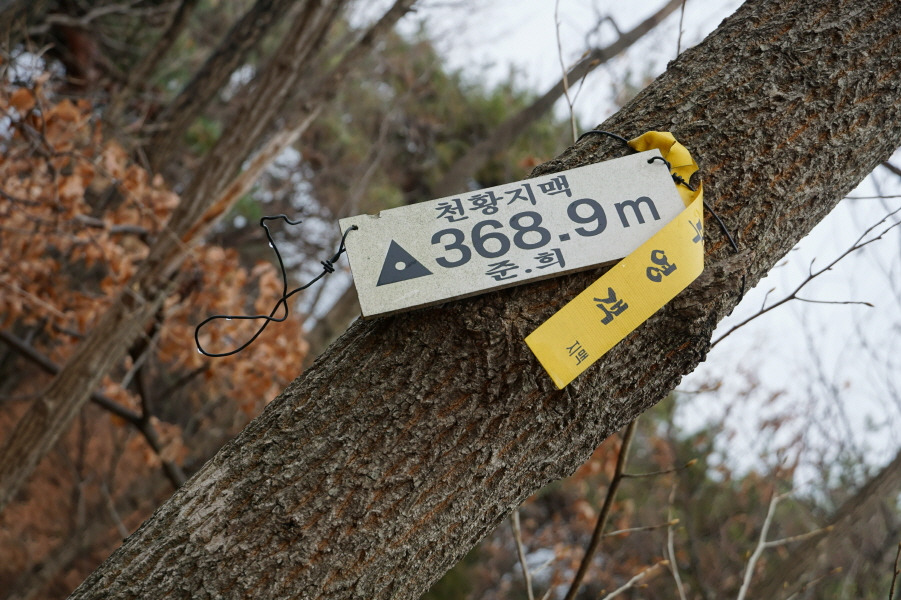 (11;05) 깃대봉(365m) 정상 한쪽만 매여있는 준희님 표지판(천황지맥 368.9m)입니다