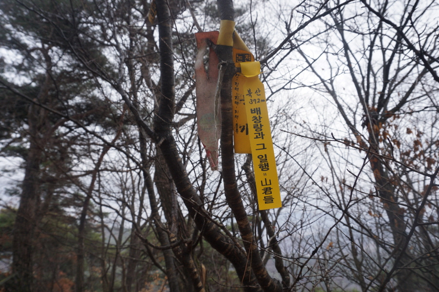 삼각점봉에서 약 80m 거리 북산(372m) 정상이다. 김문기 님 표지기 옆에 표지기"북산 372m 배창랑과 그 일행=山君들" 부착한다.