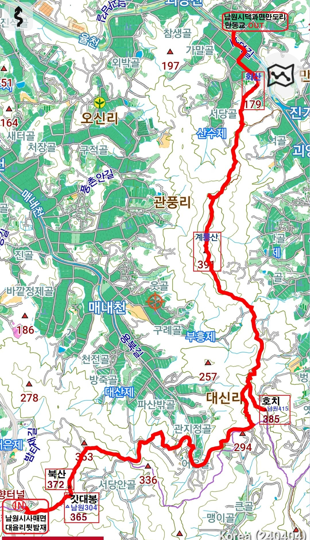 산행코스; 뒷밤재(전북남원시 사매면 대율리산 67-1)→뒷밤재솔바람길 입구 → 목책계단길 →깃대봉(365 △남원 304) → 북산(372) →나분들재 → 임도 → 도로 →325봉 → 호치(385)(왕복) →325봉 허리길→ 개인농장 능선길 → 계룡산 → 능선갈림길 → 회산(179) → 농로 → 보덕길 → 만 동교( 전북 남원시 덕과면 만도리)
