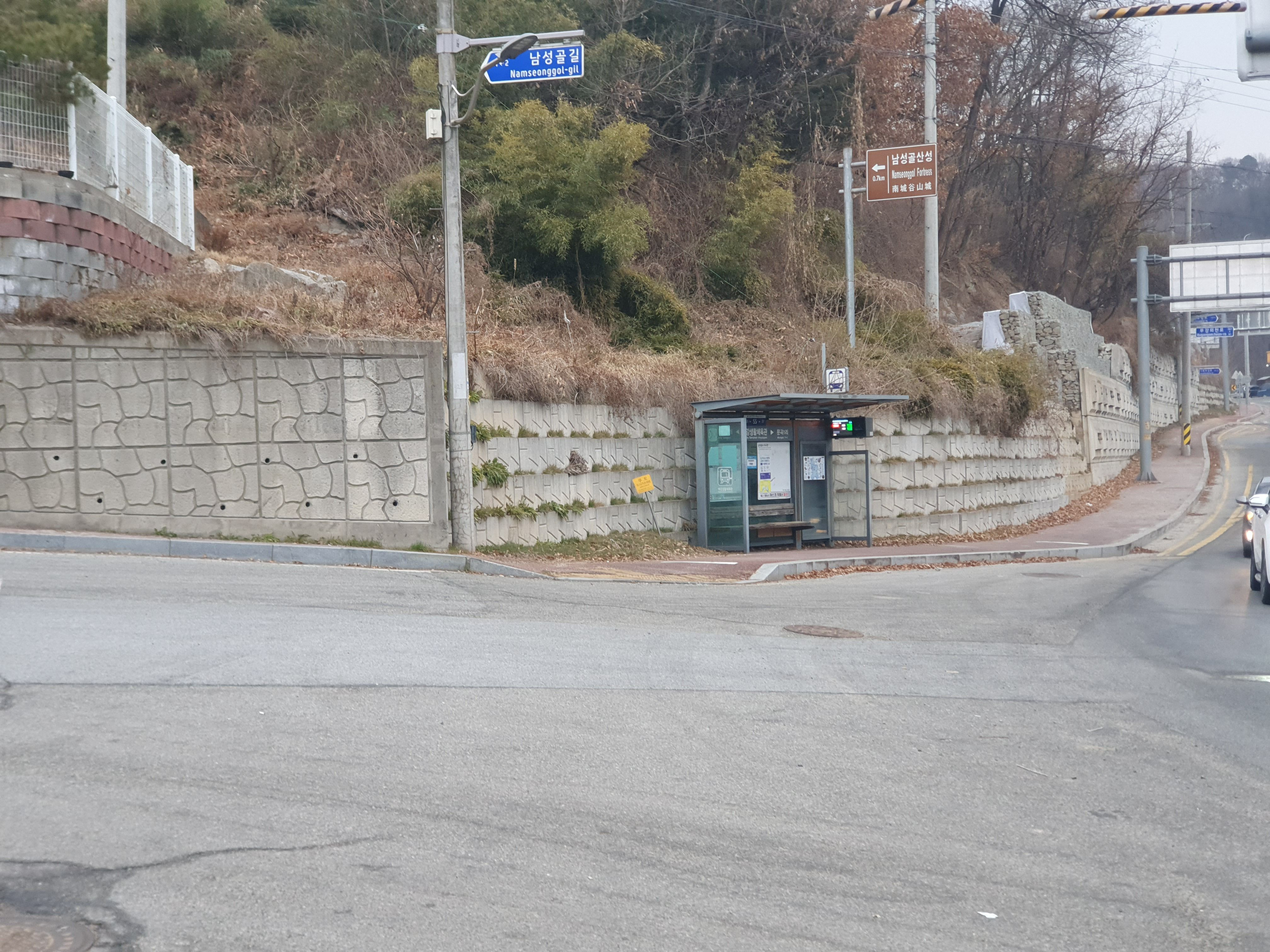 (09;17) 좌측 도로교통안내판 (남성골길) 이정표표시판( 남성골산성) 방향으로 경부선 철로 밑 도로 따라갑니다