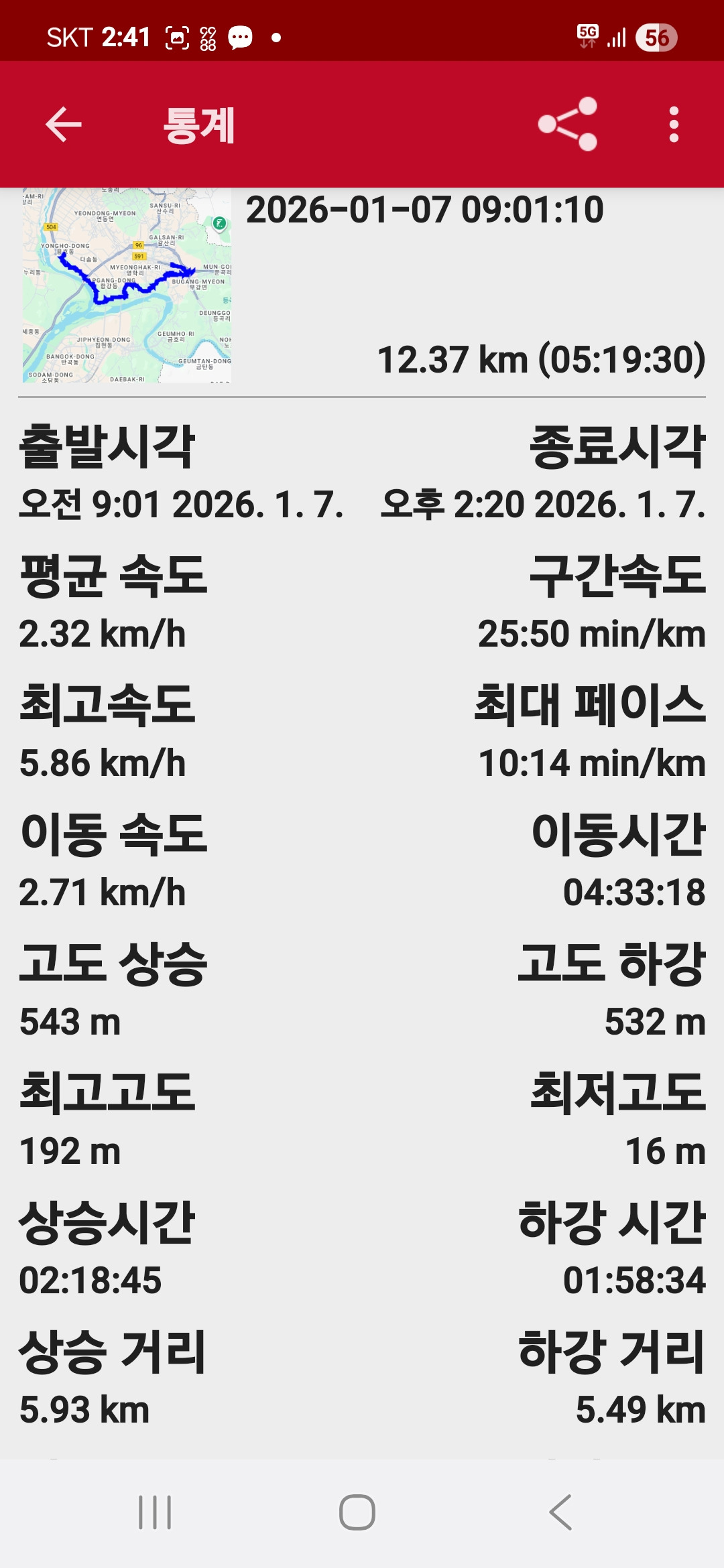 산행일자; 2026년01월07(수). 날씨; 맑음. 산행거리;12.4km. 산행시산;5시간 20분(09;00~14;20)