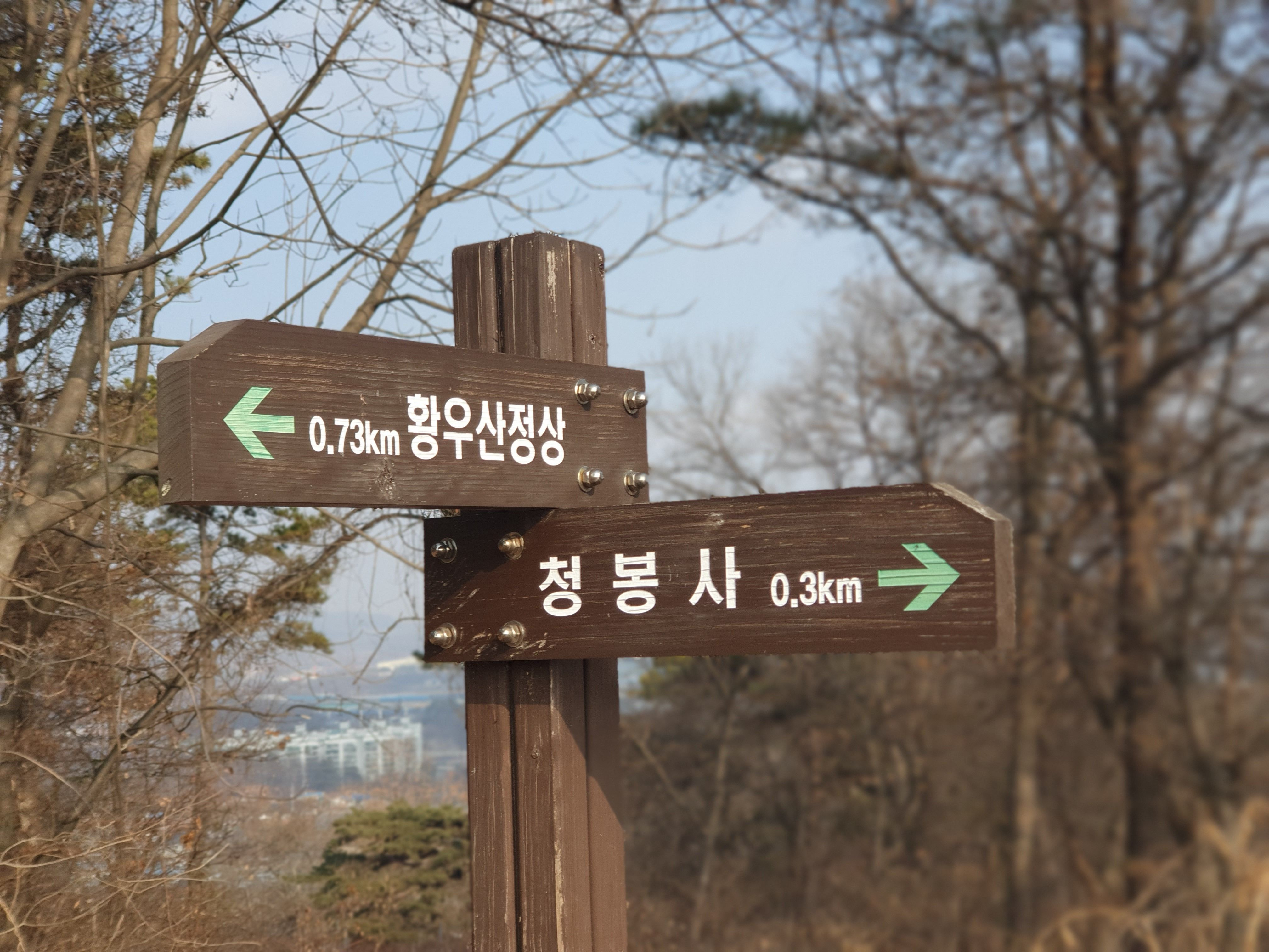 (11;05) 이정표(황우산 0.73km/청봉사 0.3km)입니다.