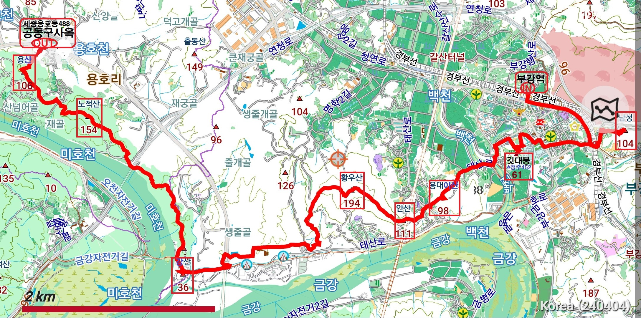 세종시 용호동 534 공동구청사 건물 앞 신설도로 인도에서 산행종료한다.