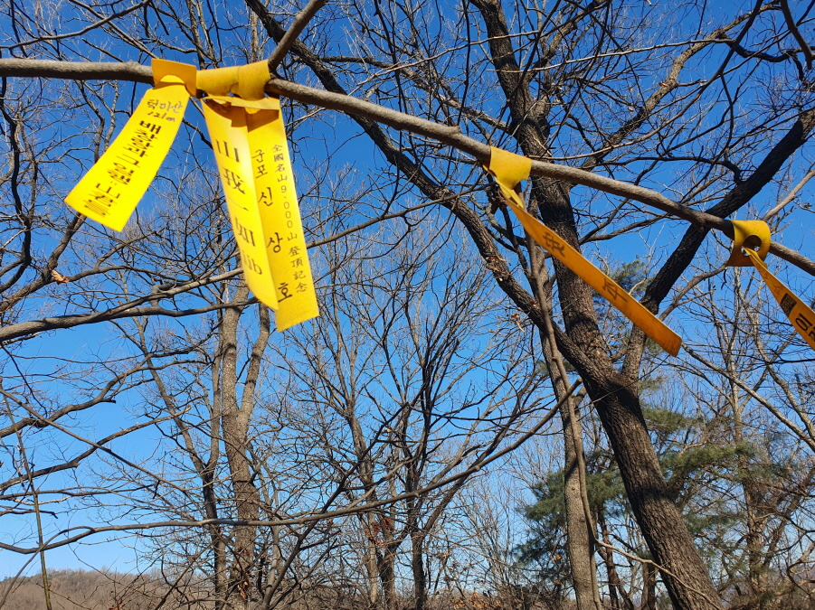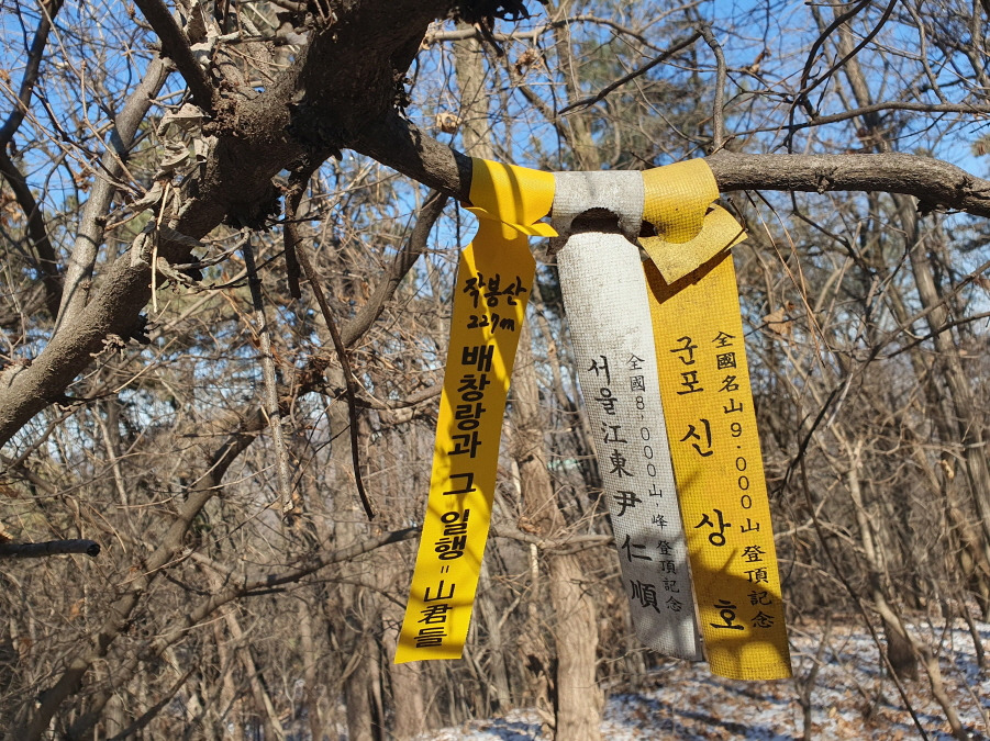 군포신상호 님 9,000 산 때 표지기, 강동 윤인순 여사님 8,000 산 때 표지기, "작봉산 229m 배창랑과 그 일행=山君들" 표지기 걸린 작봉산(227m) 정상이다.