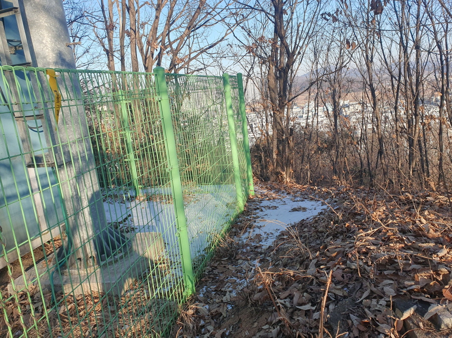 이동통신 송수신 탑 녹색보호철망 뒤에 삼각점(충북 81) 있다.
