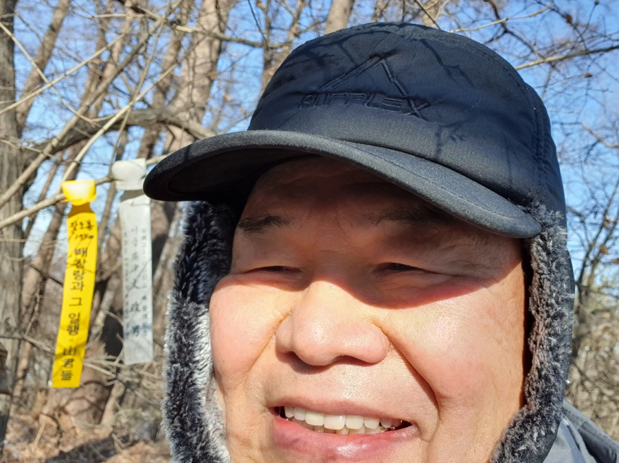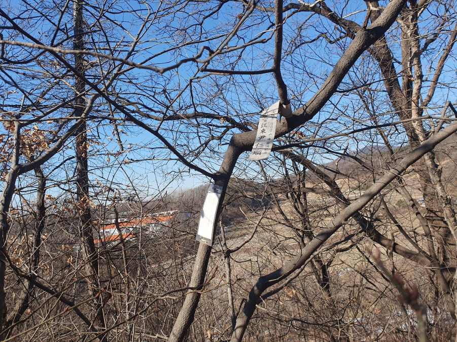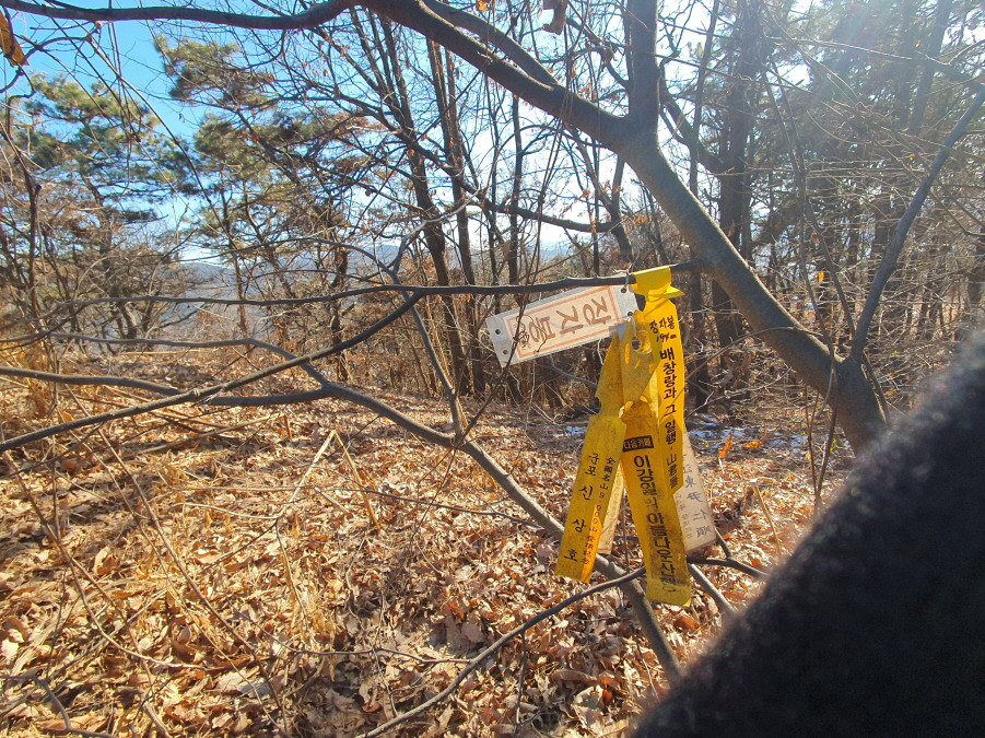 (13;25) 턱미산(121m) 정상 다른 쪽에 강동 윤인순 여사님, 배하사님 표지판이 있습니다.