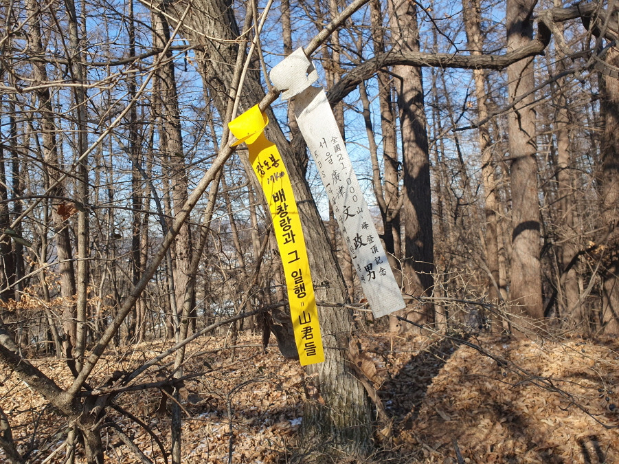 (08;50) 박산(207m) 정상 표지기 "박산 207m 배창랑과 그 일행=山君들"입니다.