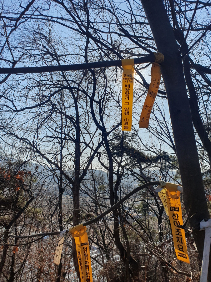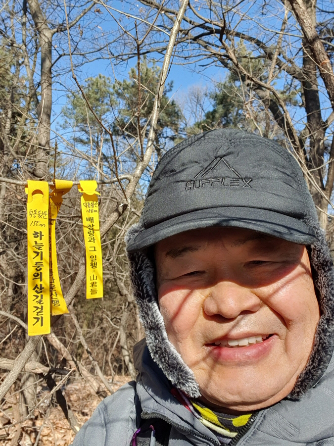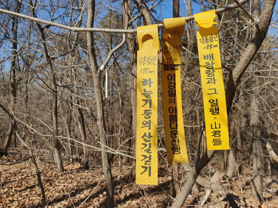 선답한 하늘기둥 산길 걷기님, 이강일 님 표지기 와"덕동뒷산 155m 배창랑과 그 일행=山君들" 표지기 걸린 덕동뒷산(155m) 정상이다.