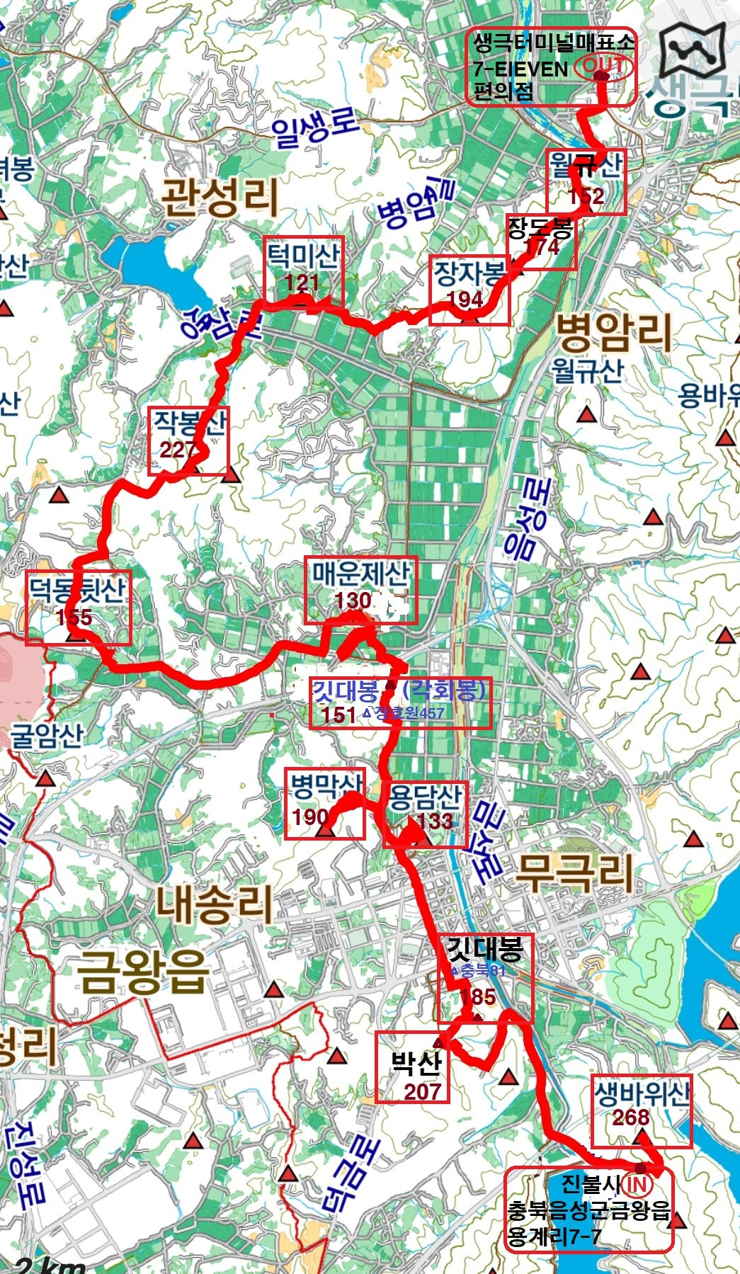 산행코스; "무극(금왕) 터미널~<택이동/5.300원>~진불사(충북 음성군 금왕읍 용계리 7-7//산행시작)~생바위산 263m(왕복)~박산 267m~깃대봉(181m 충북 81)~용담산 133m~병박산 190m~깃대봉(151m△장호원 457)~매운 재산 130m~덕동뒷산 155m~작봉산 227m~턱미산 121m~장자봉 194m~장도봉 174mㅡ~ 월규산 152m 174m~월규산 152m~생극시외버스 터미널 (산행종료) 16.59km/6시간 50분