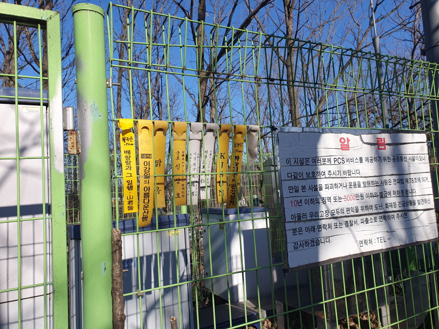 PCS서비스 공중통신 시설 보호 녹색울타리망에 많은 선답자님들(이강일 님, 맑음님, 신상호 님, 故문정남 님, 윤인순 님, 하늘기둥의 산길 걷기님, 퇴색된 표지기님) 표지기 옆에 "월규산 152m 배창랑과 그 일행=山君들" 표지기 걸린 월규산(152m) 정상이다.