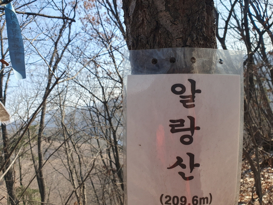 삼각점(음성 450) 있다. 선답한 대전 올산 아님 알랑산 209.6봉 표지판, 이강일 님, 도요새님 표지기와 "알랑산 210m 배창랑과 그 일행=山君들"표지기 걸린 알랑산(210m) 정상이다.