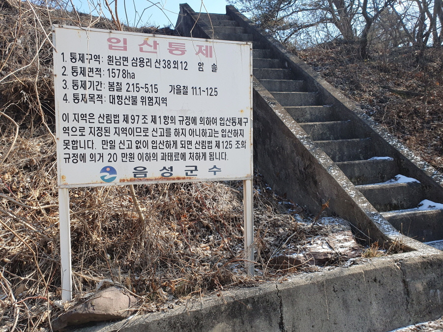 (09;28) 임도 따라 내려오면 맹동저수지 둘레길에 출입금지표지판 부착된 녹색철문입니다. 철문 좌측으로 어렵지 않게 나올 수 있습니다