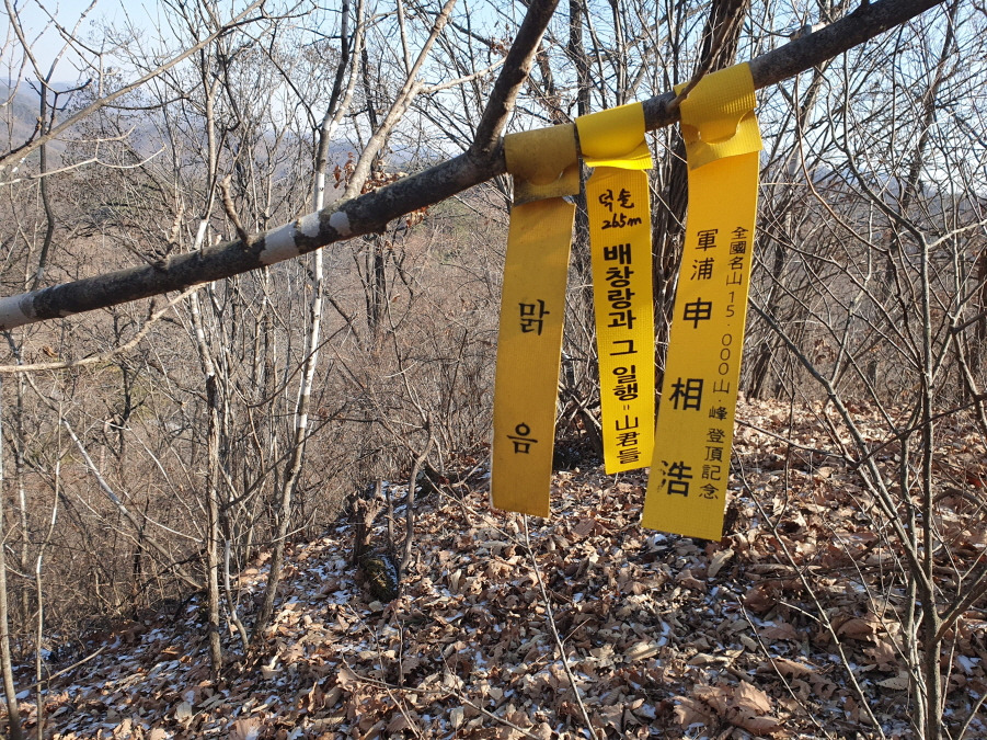 선답한 무영객 님 구진태 표지기와 신상호 님 표지기 와"구진태 255m 배창랑과 그 일행=山君들"표지기 걸린 이름도 이상한 구진태(255) 정상이다. 목표한 산을 종료하고 하산길에 든다.
