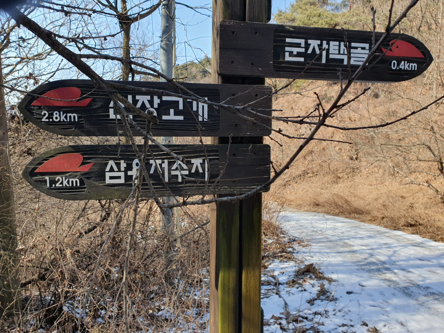도움이 안 되는 이정표(신장고개 2.8km. 삼용저수지 1.2km /군자택골0.4km) 서있다.임도따라 좌향 이다.군자택골은 우측에 있다.