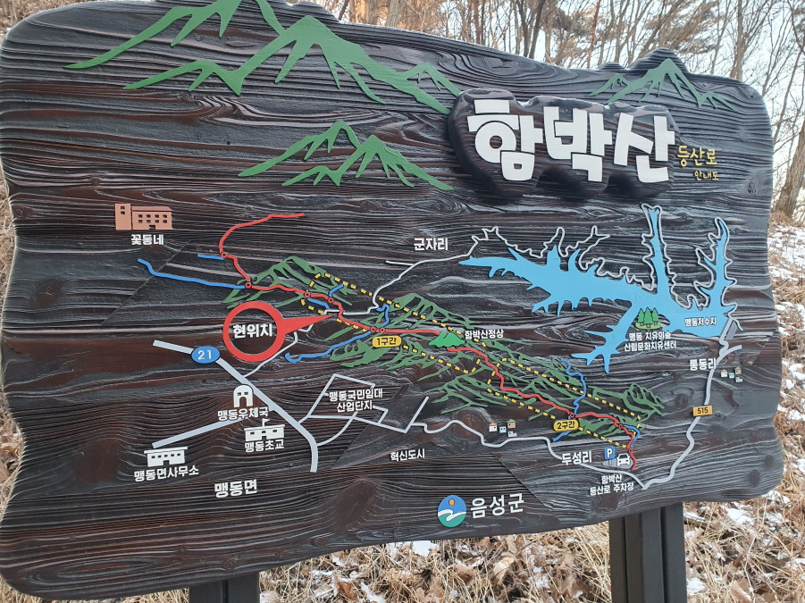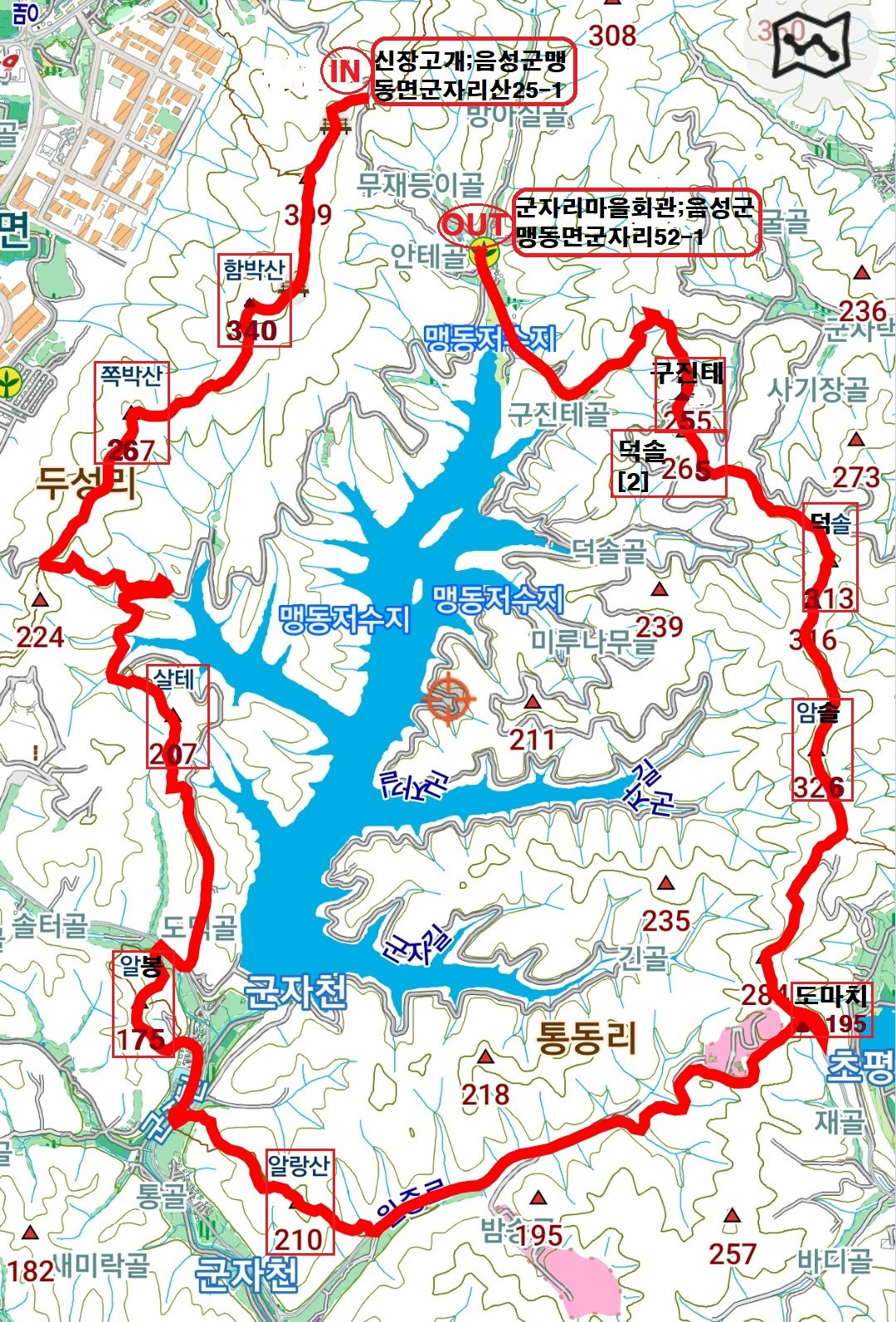 산행코스;충북 음성혁신도시 공용터미널~택시이동(9,280원/약)~[신장고개](충북음성군 맹동면군자리 산 25-1)→함박산 340 → 쪽박산 267 →육교밑 임도 → 맹동저수지수변도로 → 살테207 → 알봉 175 → 알랑산 210 → 원중로 → 도마재 → 묘지 → 284봉 → 암솔 326 → 덕솔 313 → 덕솔[ 2]265 → 구진태 255 →쉼터임도 → 2번째 임도 → 군자리 마을회관(13;40~13;47)[약 7분]~택시이동(10,240 원/약 13분)~혁신도시공용터미널 (14;00)