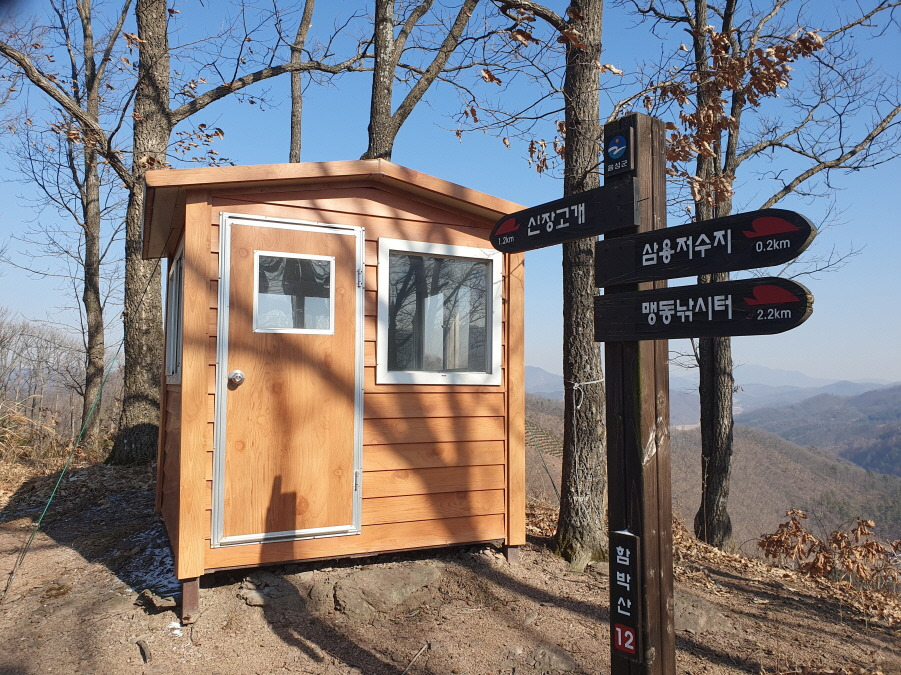 산불감시초소있다.함박산 12 이정표(신장고개1.2km/삼용저수지0.2km/맹동낚시터2.2km)서있다.조망 양호하다.