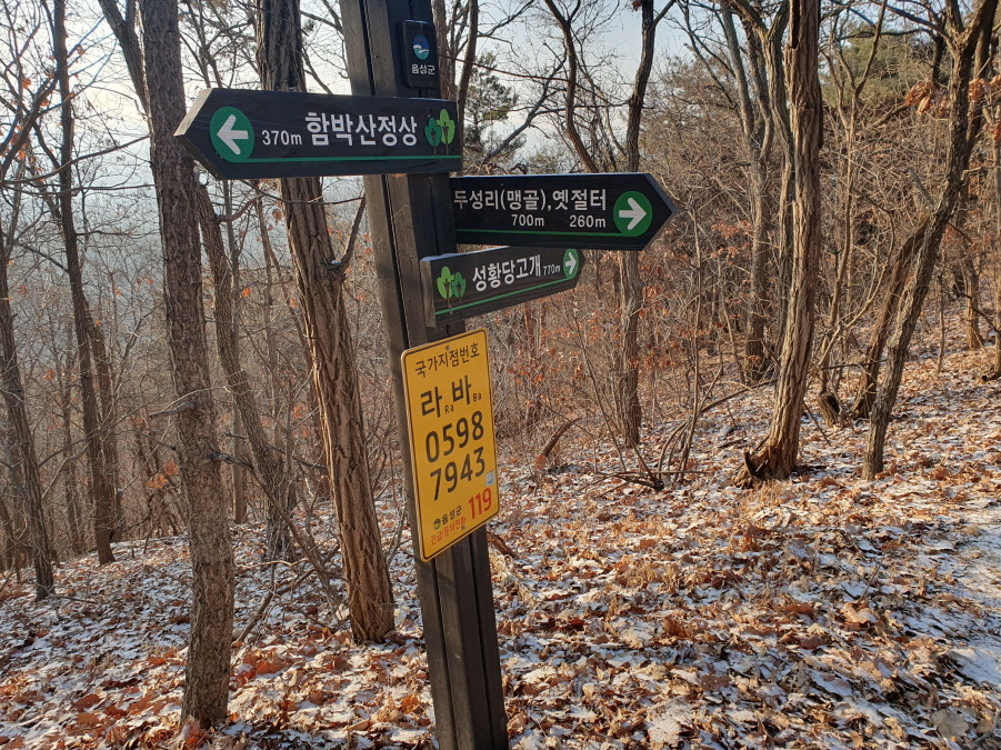 신장고개 마루에서 산행시작한다. 신장고개 (충북 음성군 맹동면 군자리 산 25-1)는 T맵에도 나온다. 군자리마을로 넘어가는 고갯마루다. 함박산 등산로 안내판과 이정표(함박산 1.2km), 국가지정번호(라바 0658 8051) 서있다.