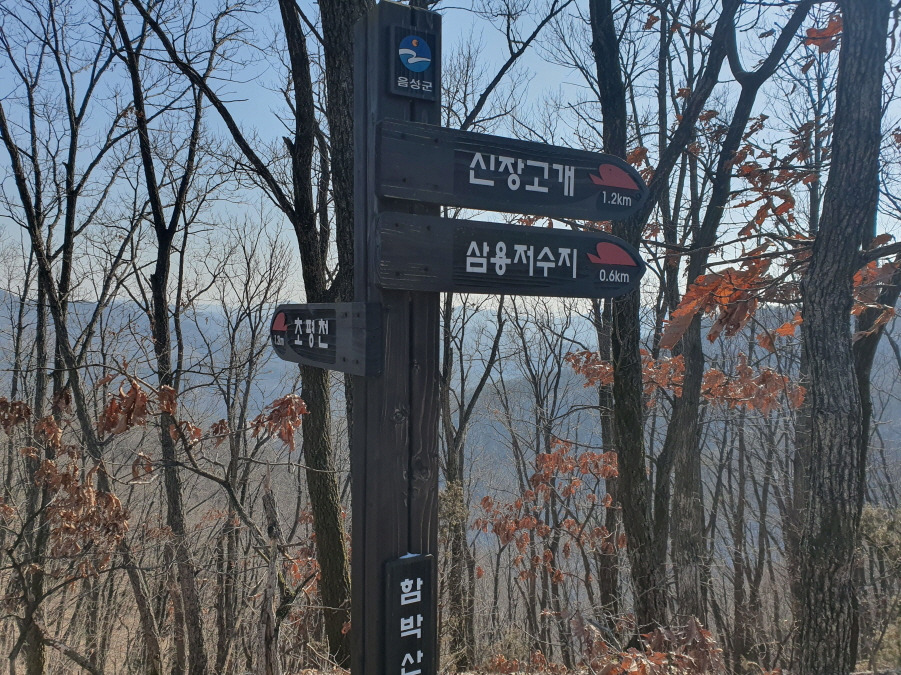 (11;54) 산불감시초와 함박산12 이정표(신장고개 1.2km/삼용저수지 0.2km/맹동낚시터 2.2km)입니다.
