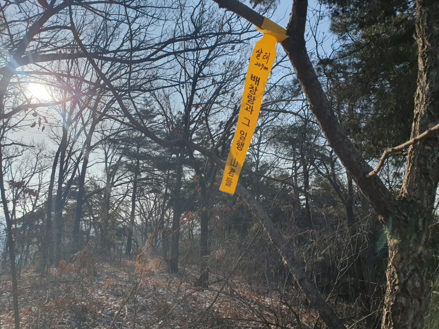 "테"는 "테두리" 또는 "터"를 의미 하무로 맹동저수지 테두리의미 인지~? 저수지 둘레길에서 큰 마마음을 먹고 꼭 올라야겠다는 마음이 아니면 안 될 정도로 등로는 거의 개척 수준인 곳으로 청소될만한 곳도 아닌데 선답자님들 표지기가 1장도 없는 것은 산이름이 최근에 생긴 것인지~?"살 테 207m 배창랑과 그 일행=山君들"표지기 최초로 건다.