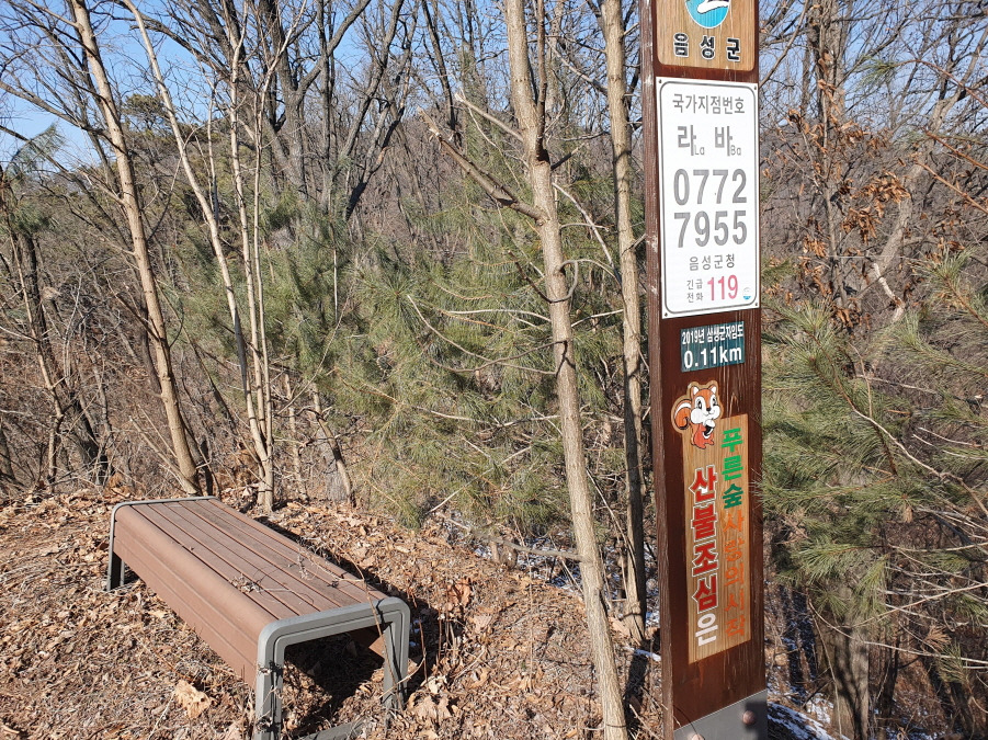 (13;18) 장의자 2개와 국가지정번호 라바 07727955 부착된 음성군 산불조심은 푸른 숲살의 시작 안내판 서있는 첫 번째 임도입니다. 이 임도는 엄청 돌어 군자리마을회관에 연결되기 때문에 능선을 더 타고 다음 임도에서 군자리마을 회관으로 이동해야 합니다