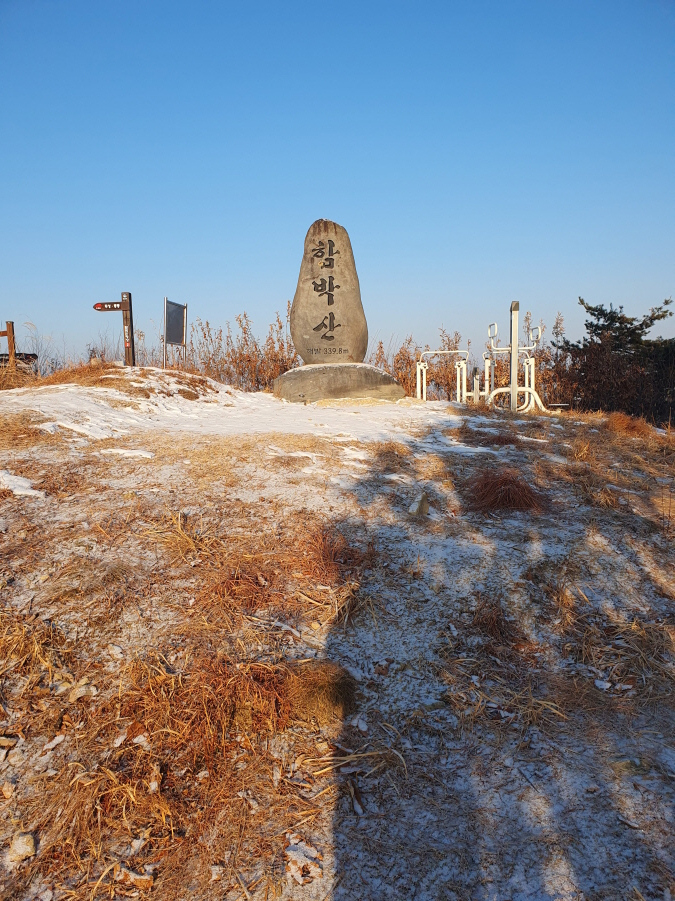눈이 남아있지만 등로가 좋아 쉽게 정상에선다. 커다란 함박산 정상석 , 팔각정자, 전망대 데크시설이 되어있다. 조망 양호하다.